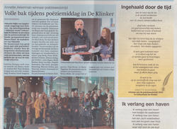 Het gedicht 'een moment om stil te staan' verdiende de 2e prijs bij Dichter bij Waalwijk en is nu opgenomen in het bundeltje Finalegedichten